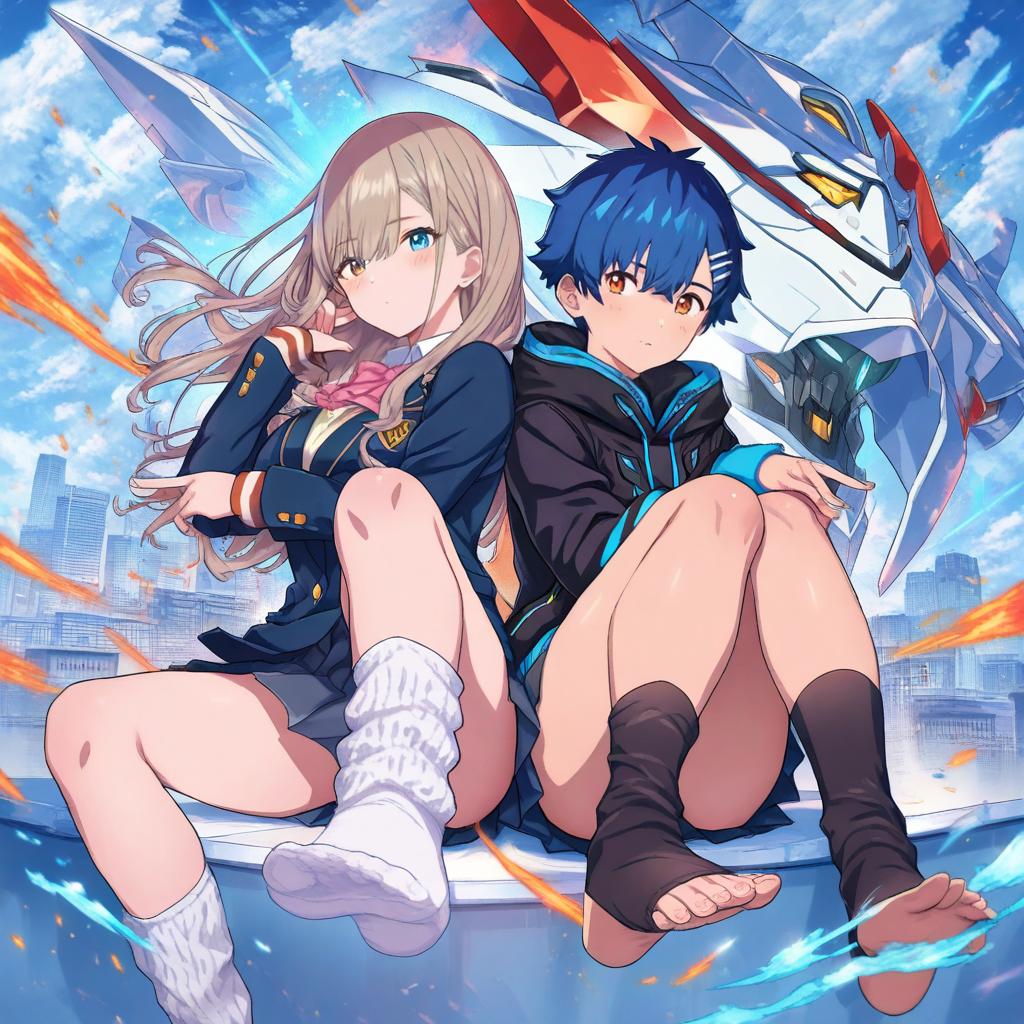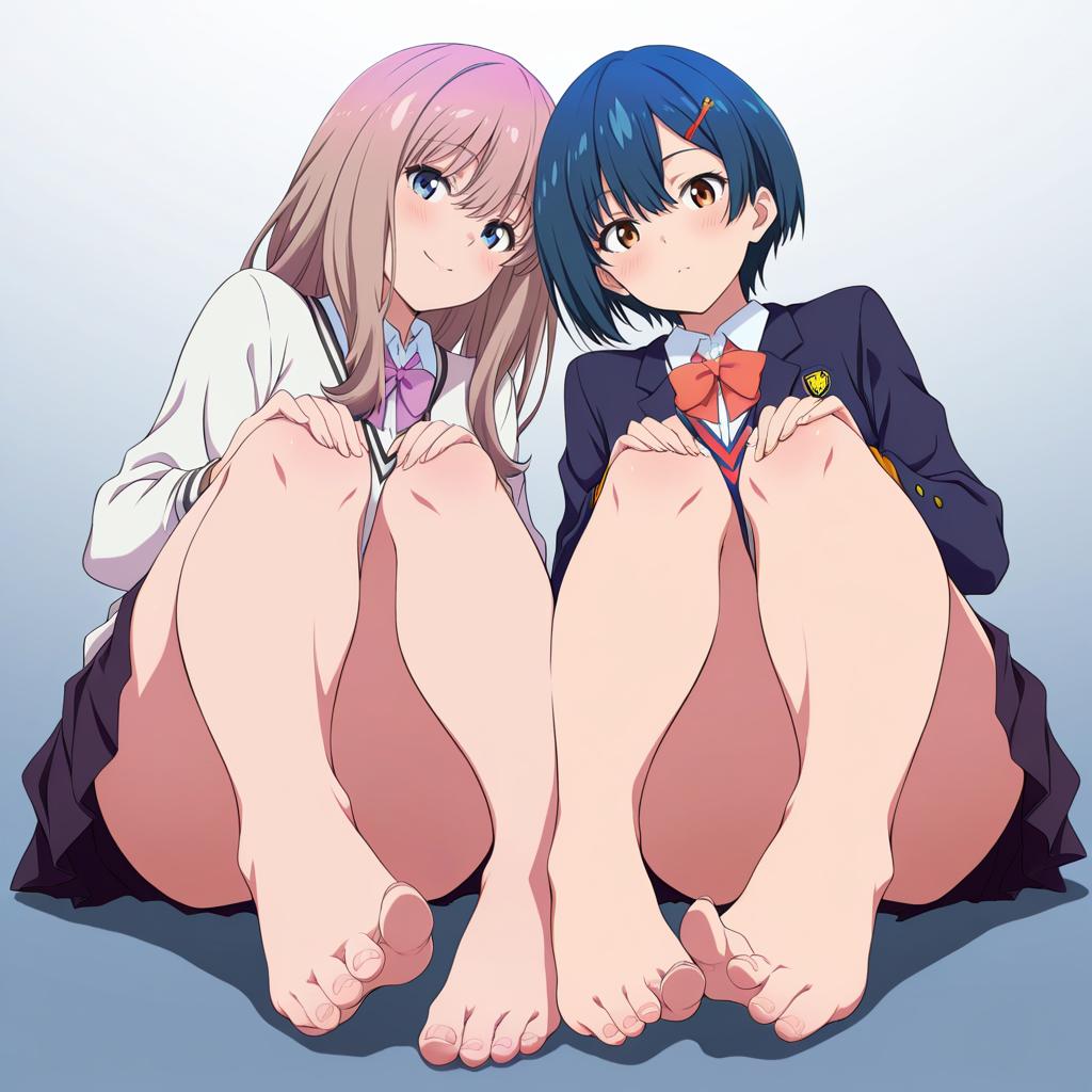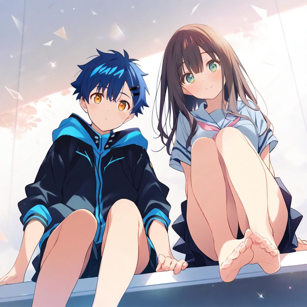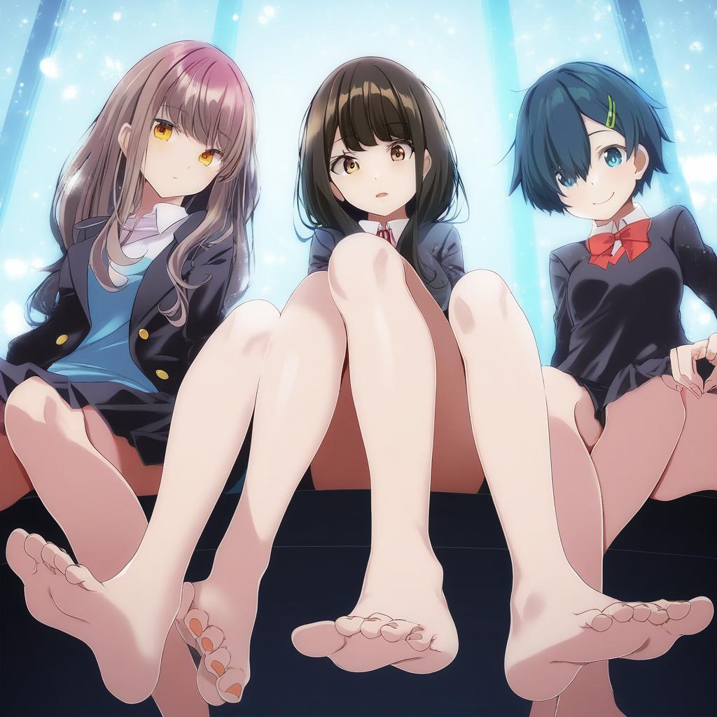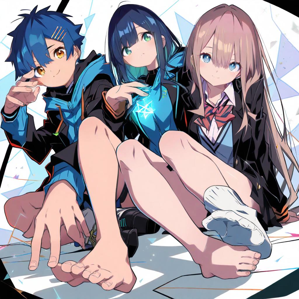 Asanaka yomogi, gridman universe, hair between eyes, orange eyes, yellow eyes, green eyes, blue hair, long hair, brown hair, short hair, feet, school uniform, toes, fingernails, by artist noya makoto, animagine