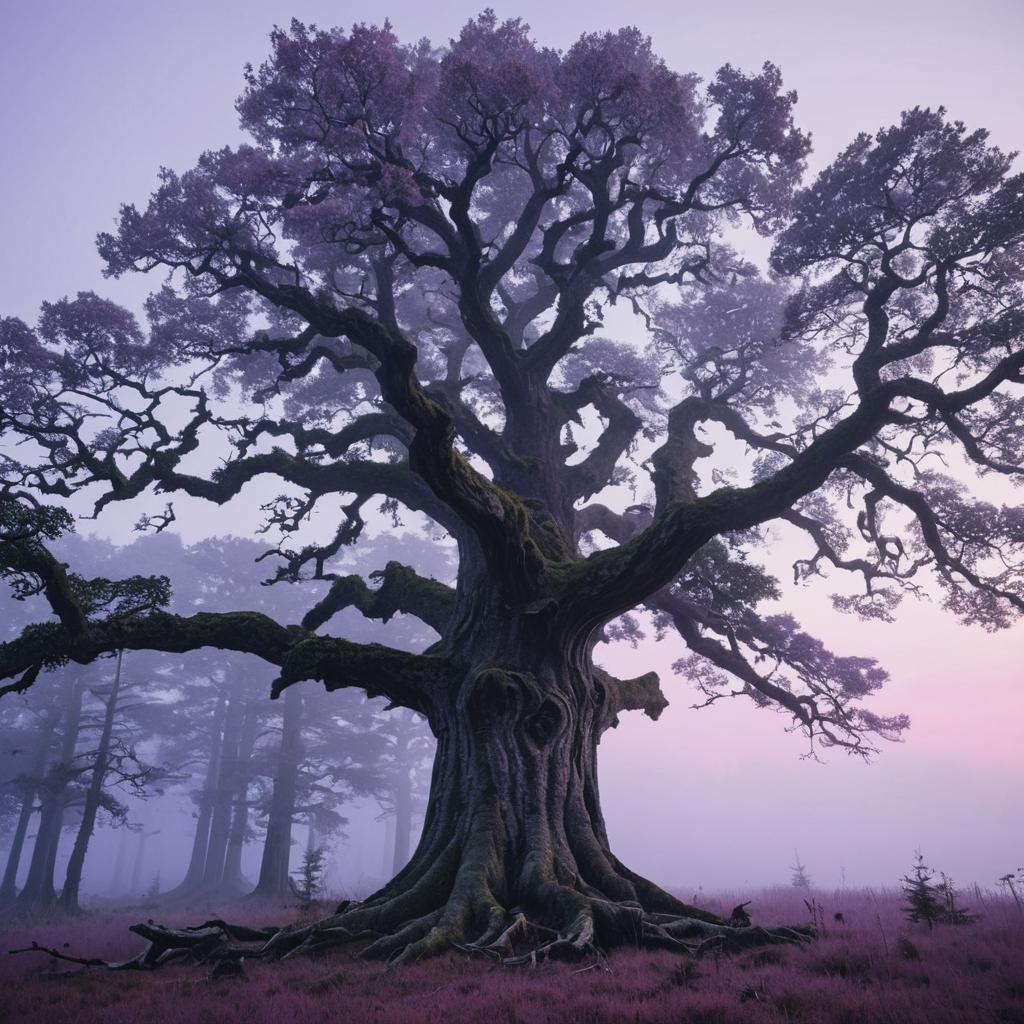 A majestic ancient oak tree with sprawling branches and exposed roots stands prominently in a misty forest at dawn. The scene features soft pink and lavender hues in the sky, creating a mystical and ethereal atmosphere. The surrounding forest fades into the mist, enhancing the sense of depth and tranquility. The image has a painterly, hyper-realistic style inspired by John Bauer and Caspar David Friedrich.
