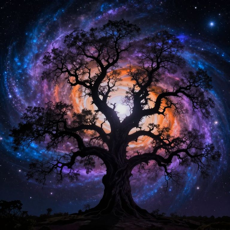 Digital artwork featuring a silhouetted, sprawling, leafless tree with intricate, dark branches centered against a vibrant, swirling galaxy background. The galaxy showcases vivid colors, including bright oranges and purples, with a luminous white core. Surrounding the tree are countless stars, adding to the cosmic theme. The dark, textured trunk contrasts with the colorful, ethereal galaxy, creating a striking, otherworldly scene. The overall style is a mix of realistic and fantastical elements, emphasizing the tree's silhouette against the dynamic, colorful celestial backdrop.