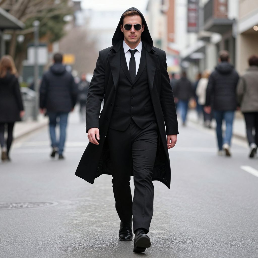 Confident young man wearing a black villain costume consisting of a long hooded coat, black suit, white shirt, and tie. He is walking down an urban street confidently, wearing dark sunglasses, with blurred pedestrians in the background.