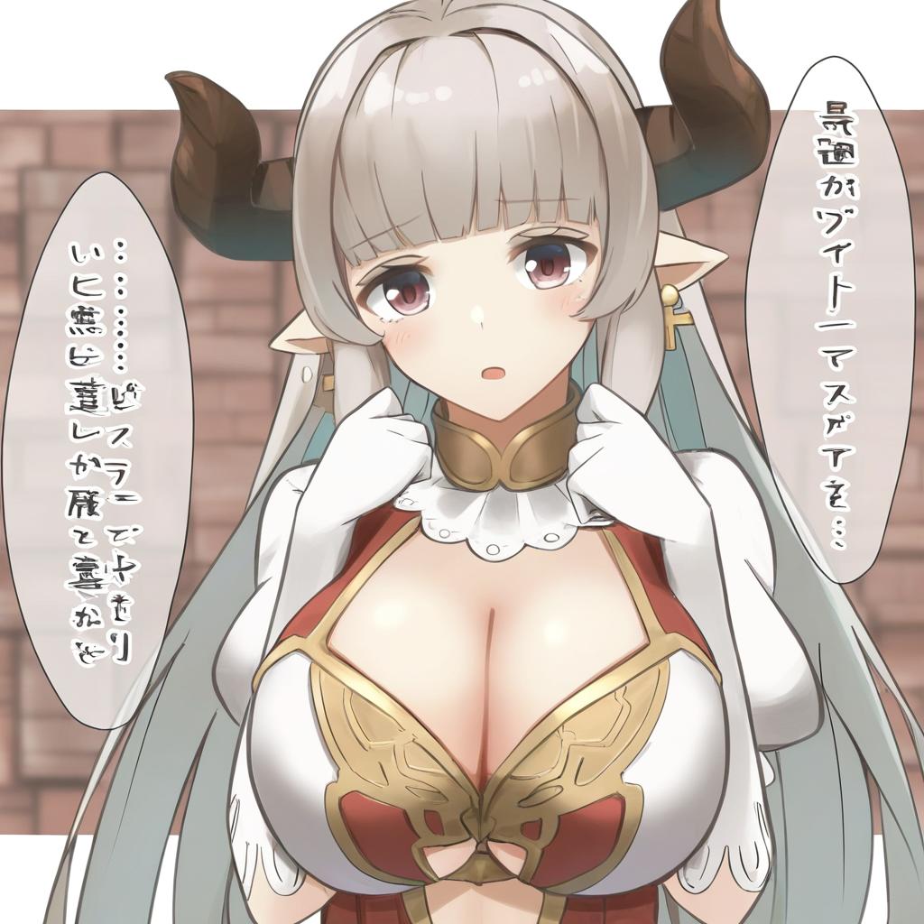 Alicia (granblue fantasy), granblue fantasy, 1girl, horns, pointy ears, red eyes, long hair, grey hair, white hair, blunt bangs, large breasts, huge breasts, cleavage, white gloves, center opening, earrings, cross earrings, draph, by artist negahami, leet