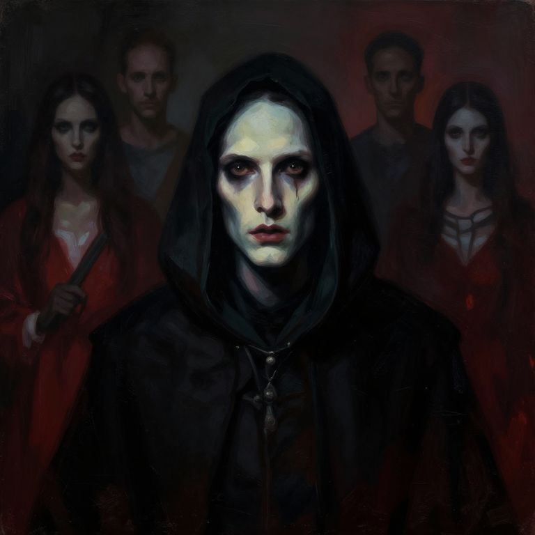 Wargrave in a surreal, symbolic depiction with elements of the seven deadly sins subtly integrated into the background, with a haunting, expressive face illuminated by eerie, unnatural light, rendered in an abstract painterly style blending realism and surrealism.