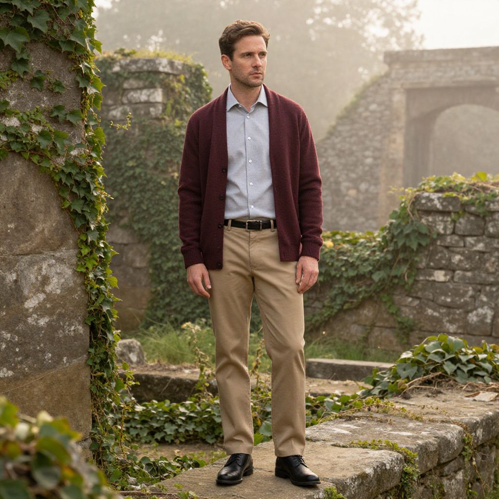 A man, burgundy cotton cardigan, light gray dress shirt, khaki slacks, black oxford shoes, matching black belt, ancient stone ruins, overgrown with ivy, misty morning light, contemplative expression, soft focus, warm tones. Man has masculine face and piercing eyes