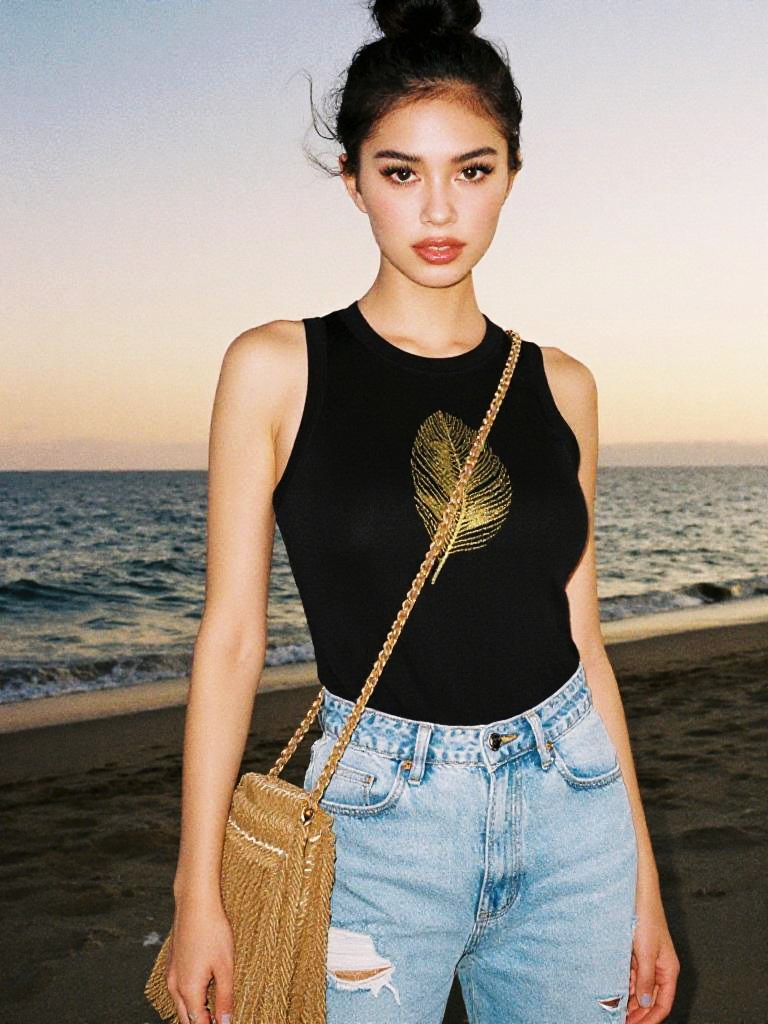 Photograph of an Asian woman standing on a beach at sunset. She has fair skin, dark hair in a high bun, and wears a black sleeveless top with a golden leaf design, paired with light blue, high-waisted, ripped jeans. She carries a gold chain purse on her left shoulder. The background features a calm ocean with gentle waves and a gradient sky transitioning from orange to blue. The lighting highlights her face and outfit, creating a slightly dramatic effect.
