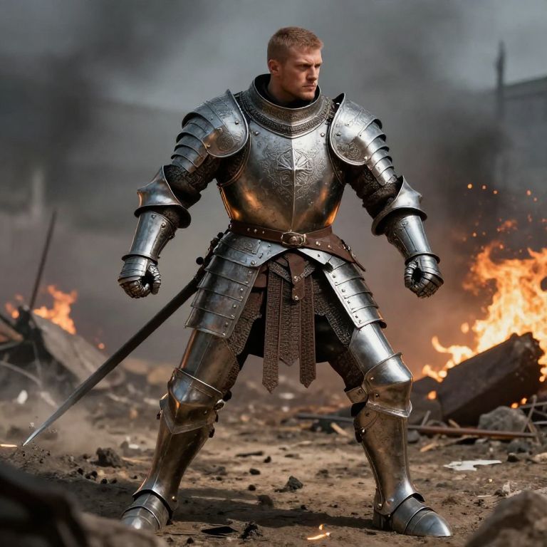 Photograph of a muscular, young, blond male knight in shiny, silver armor standing in a battle-scarred, smoky field with burning wreckage