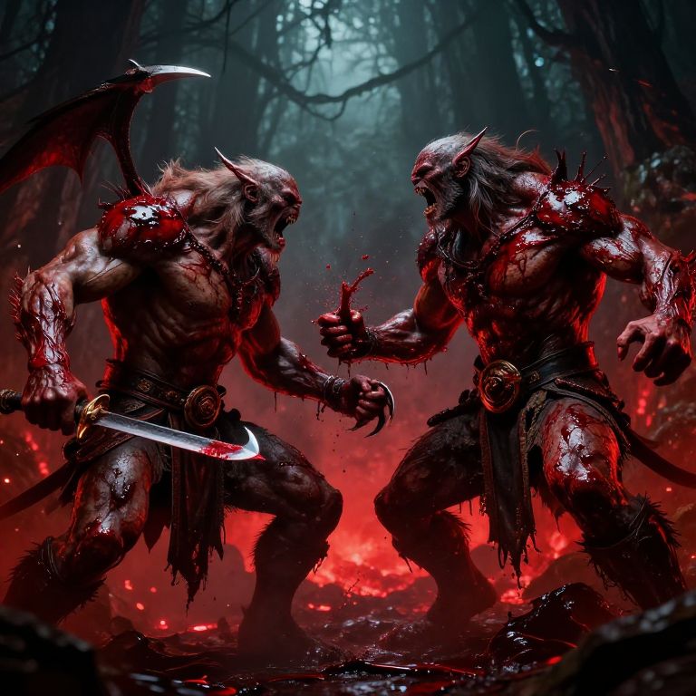 Livegore fantasy duel between monstrous creatures, richly colored blood sprays mid-action, sharp claws and weapons tearing flesh, dynamic poses with intense expressions, dark mystical forest backdrop with glowing red accents, highly detailed textures emphasizing wet and sticky blood effects.