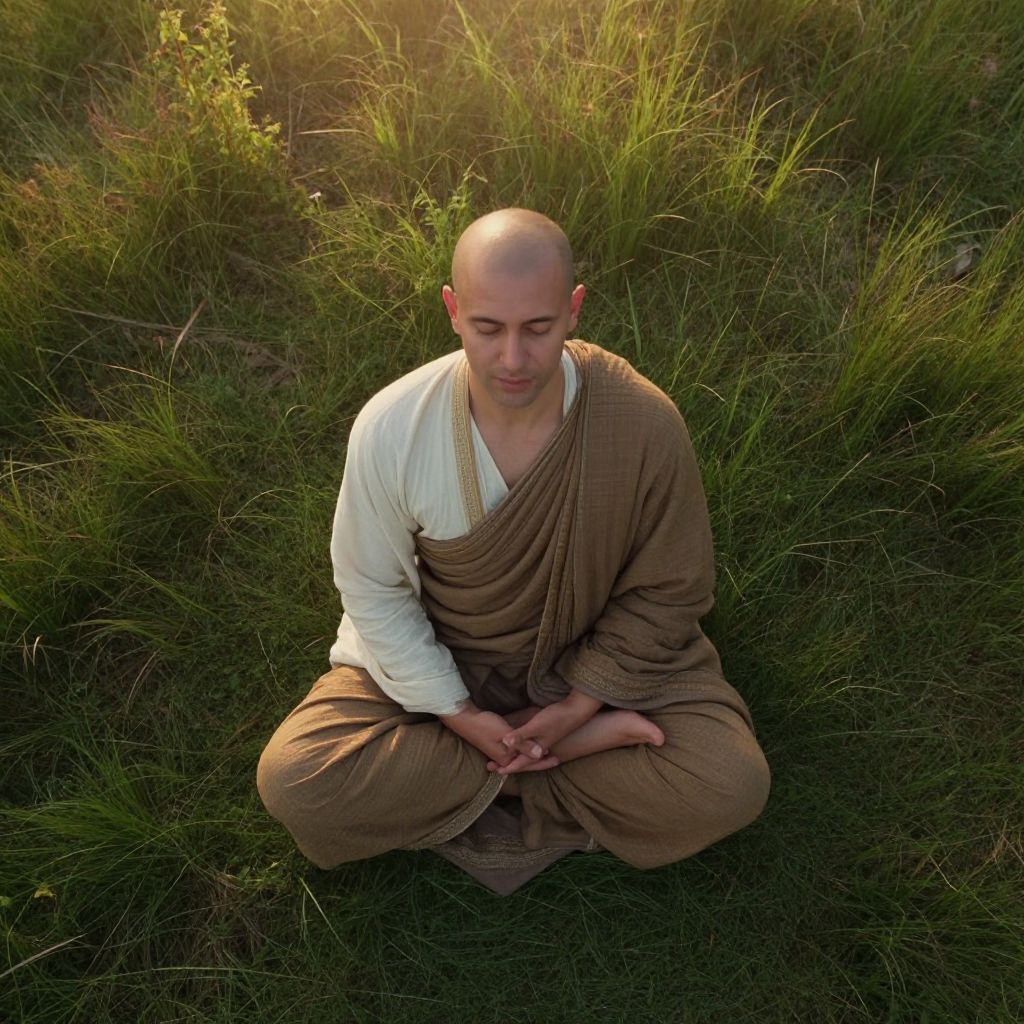 Photograph of a bald Buddhist monk in brown and white robes, sitting cross-legged in a grassy field, hands in meditation position, sunlight filtering through