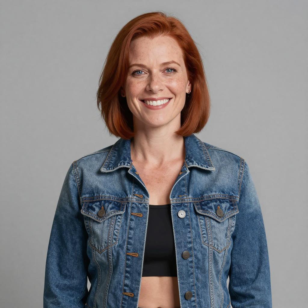 Photograph of a smiling, fair-skinned, red-haired woman with shoulder-length hair, wearing a blue denim jacket over a black crop top, against