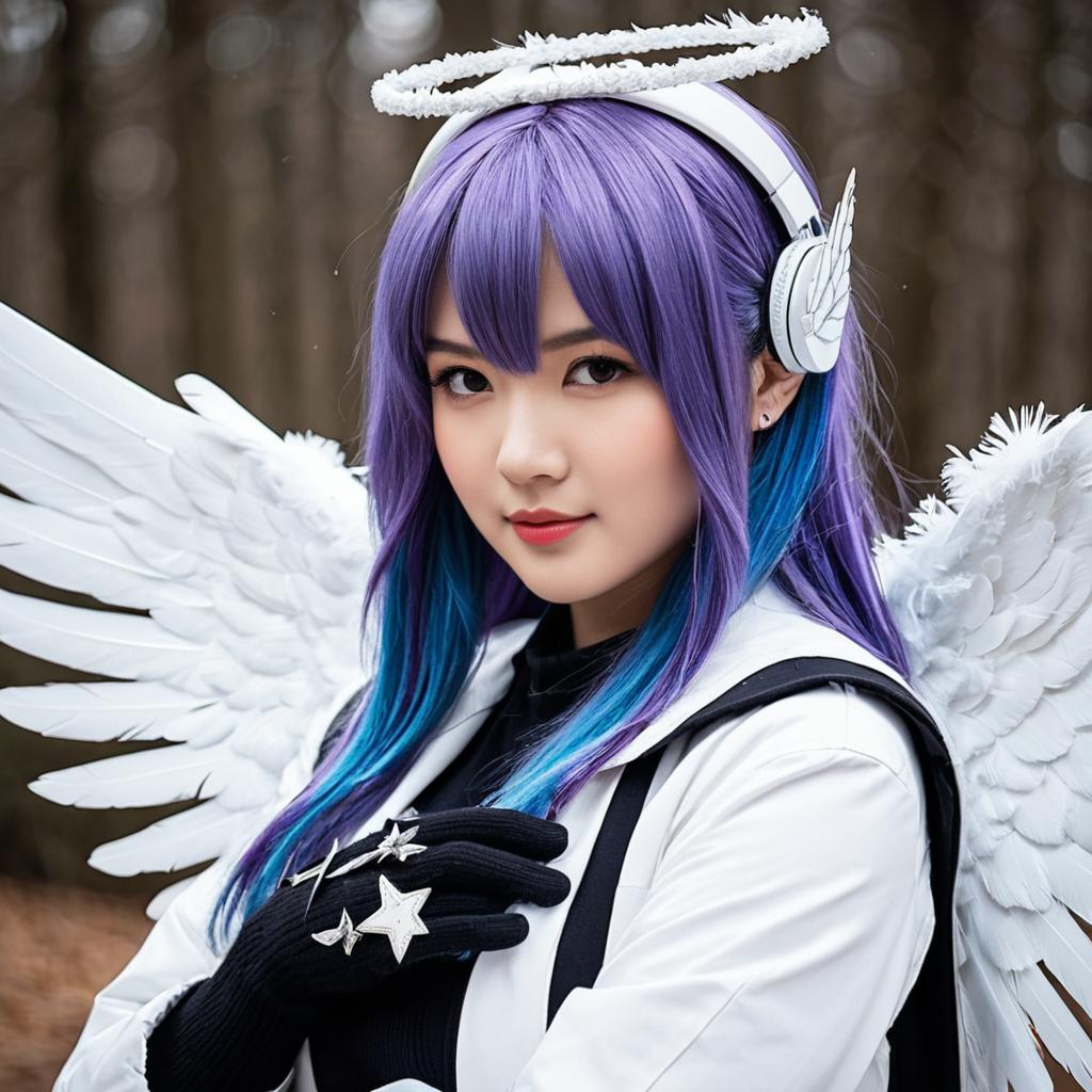Photo-realistic portrait of a young woman in cosplay dressed as an angel with purple and blue hair, wearing white angel wings, a white halo, black gloves with star decorations, and a white jacket over a black dress. The image features shallow depth of field with a soft natural background. The subject has vibrant makeup and wears white headphones with wing details, embodying the character Amane Kanata.