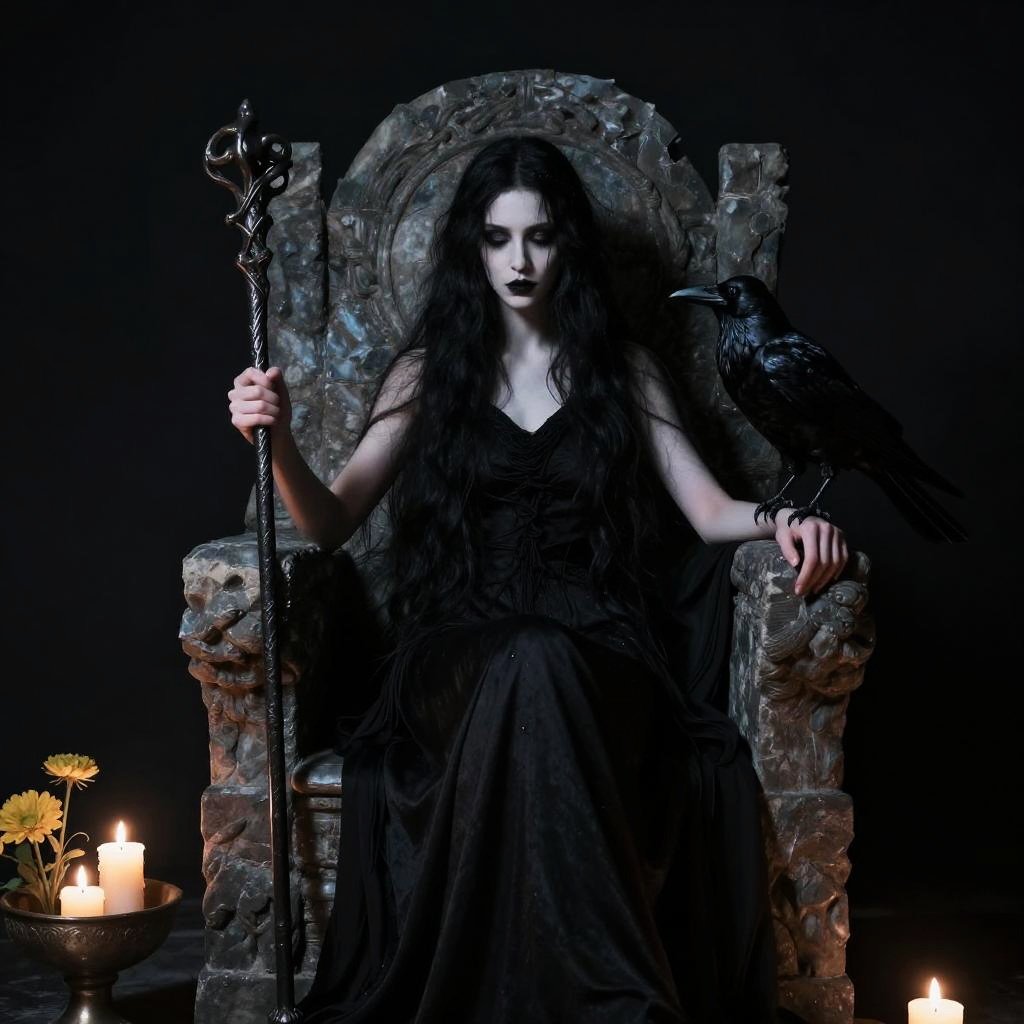 Digital artwork depicting a pale-skinned woman with dark flowing hair, partially obscured by a large black bird with outstretched wings. The background features dark blue and purple hues, enhancing the eerie and haunting atmosphere. The woman's intense gaze contrasts with the dark surroundings, while the bird's detailed feathers add to the mysterious and ominous vibe.