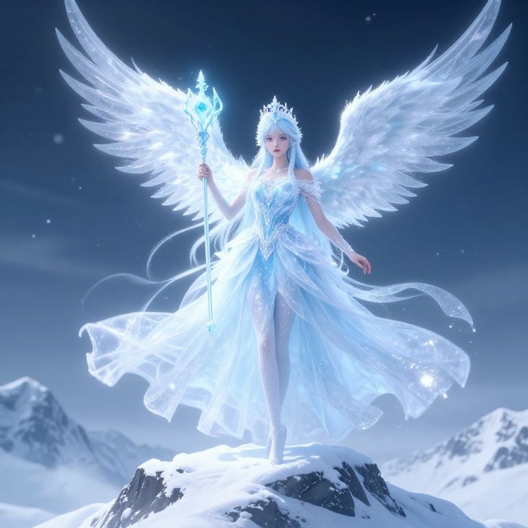 An ethereal ice princess anime girl with translucent icy wings standing atop a snowy mountain peak, her gown glittering like frost, holding a glowing ice staff, very graceful and mystical aura, intricate fantasy anime style with cool tones and dynamic lighting effects.