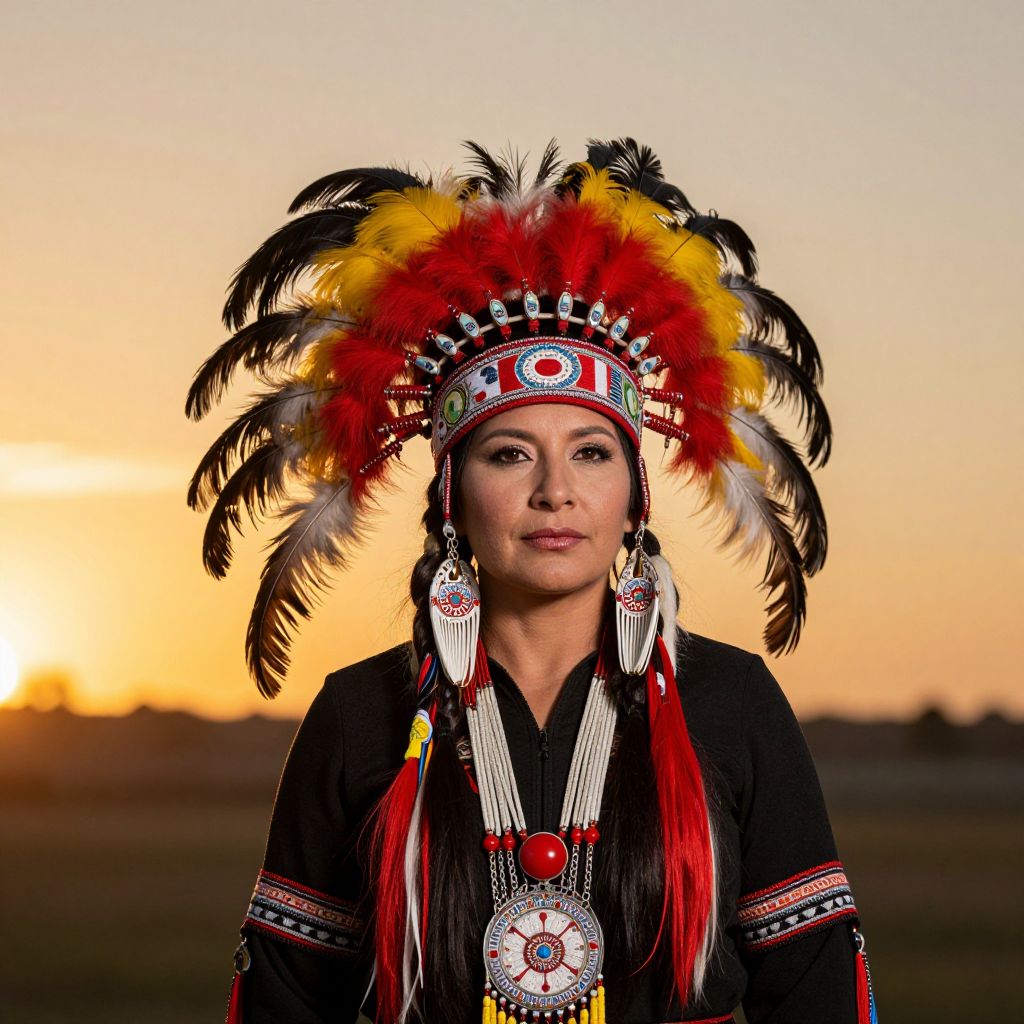 Native American woman wearing a vibrant red and black headdress adorned with yellow and black feathers, complemented by intricate jewelry and traditional attire, stands gracefully against a golden sunset backdrop.