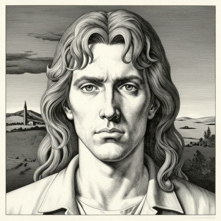 This is a black and white, highly detailed, digital illustration in a comic book style. It features a close-up of a young man with long, wavy hair that falls past his shoulders. He has a strong, symmetrical face with pronounced cheekbones, a straight nose, and intense, focused eyes. His expression is neutral, almost serious. He wears a collared shirt, and the background shows a landscape with hills, trees, and a distant, tall structure resembling a tower or monument. The sky is cloudy, adding a dramatic contrast to the scene. The artist uses cross-hatching and fine lines to create depth and texture.