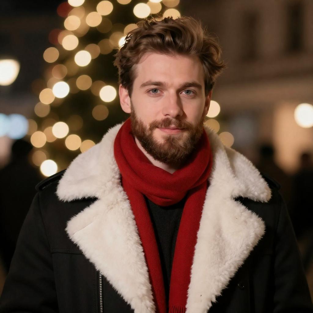 Photograph of a handsome, bearded man with light brown hair, wearing a black coat with a white fur collar and a red scarf. He stands against a blurred background of warm, glowing bokeh lights, creating a festive, nighttime atmosphere. His expression is slightly smiling, and he looks directly at the camera.