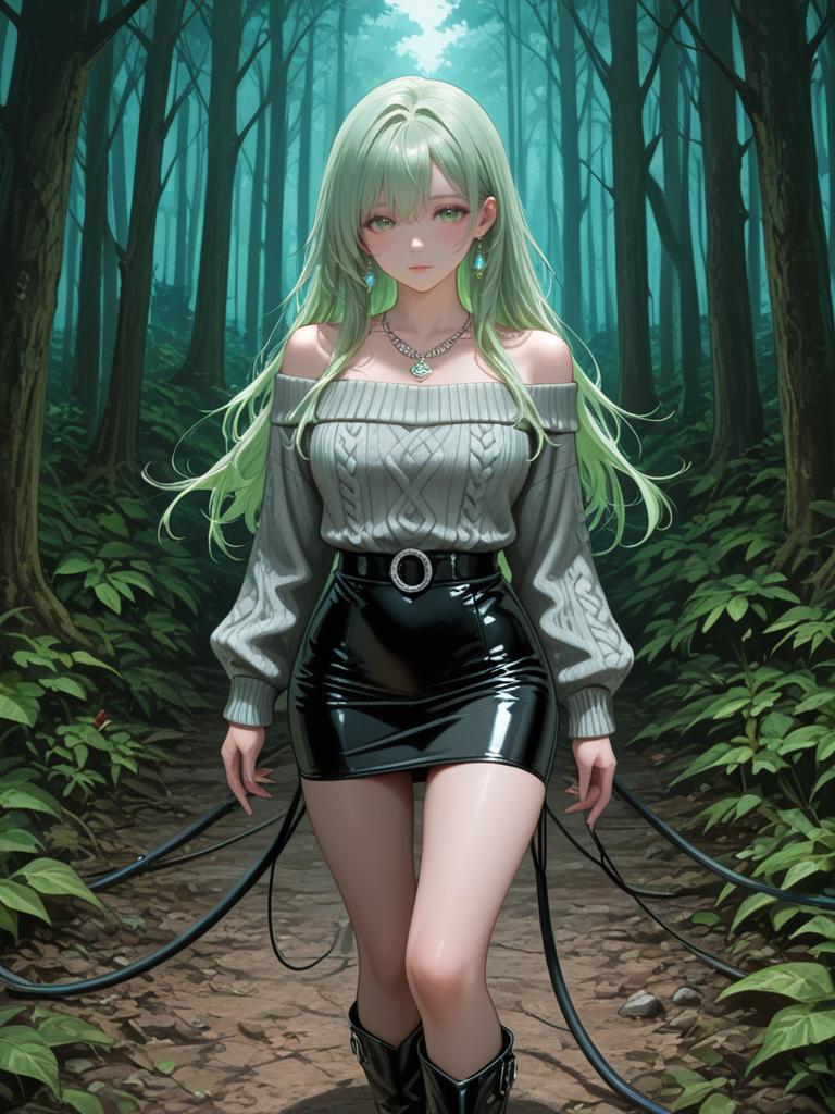 1girl, solo, shorts, tattoo, breasts, gloves, fingerless gloves, navel, green shorts, green hair, outdoors, midriff, gun, crop top, weapon, jewelry, green eyes, arm tattoo, choker, green lips, drill hair, tank top, grass, looking at viewer, black lips