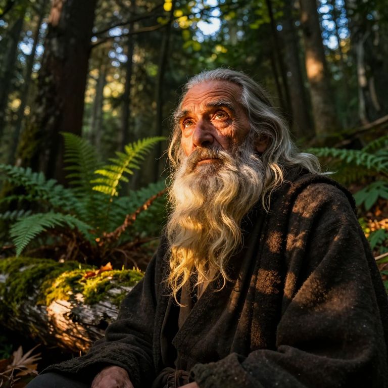 Photograph of an elderly white man with long, wavy white hair and a full, bushy white beard, sitting in a dense forest. He wears a dark, rough-textured cloak and gazes thoughtfully into the distance. Sunlight filters through the trees, casting a warm glow on his face and beard, creating a contrast with the shadowed forest background. Ferns and fallen leaves are visible at his feet, adding to the natural, rustic setting. The image has a high-contrast, vivid color style, emphasizing the man's serene expression and the forest's rich textures.