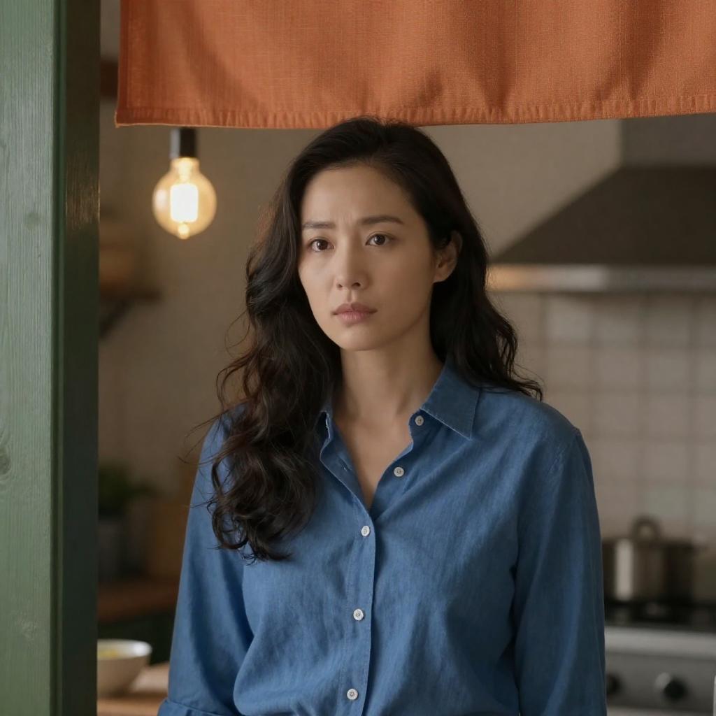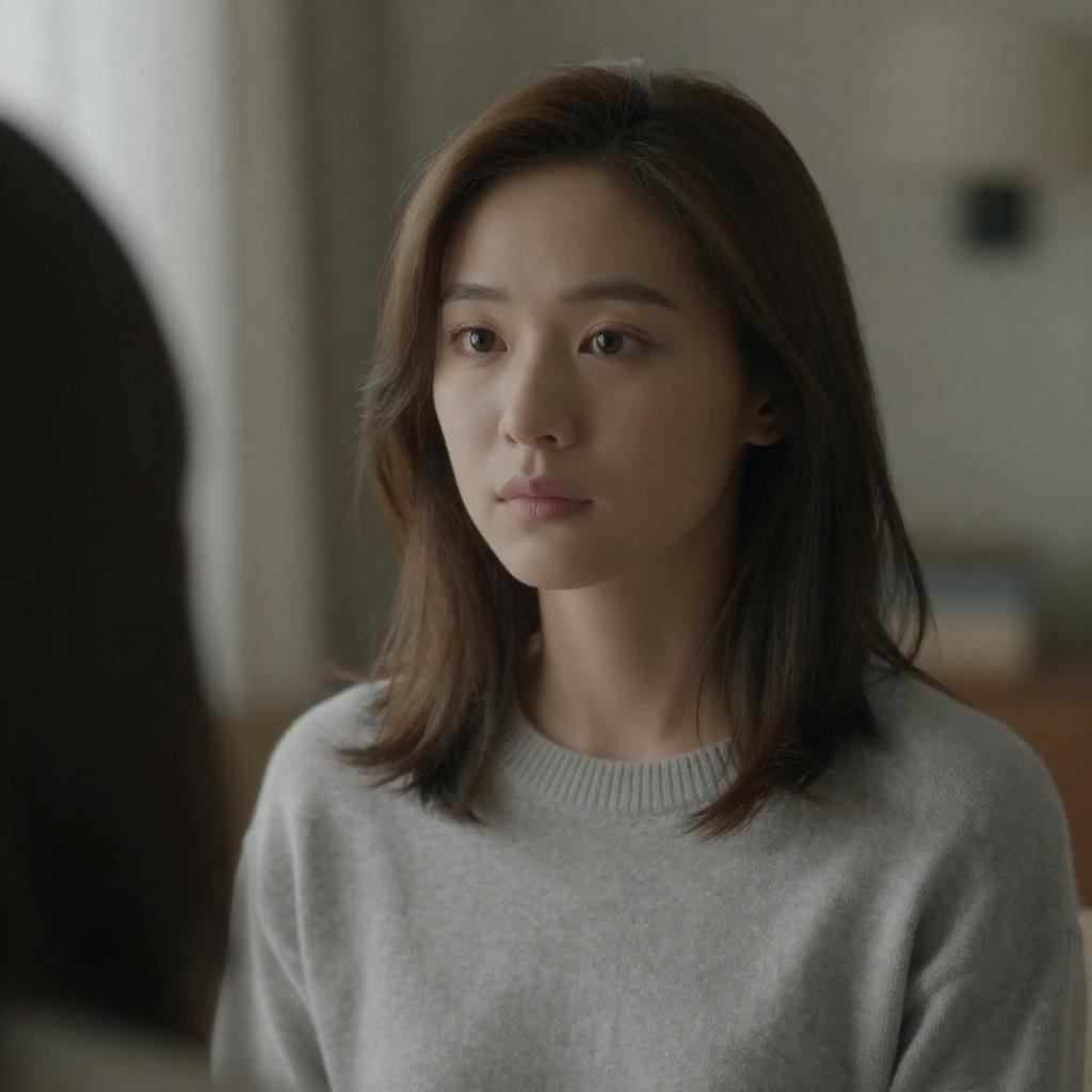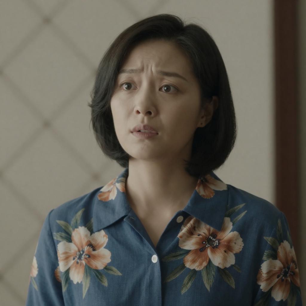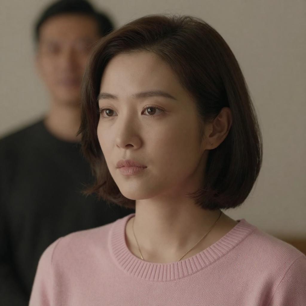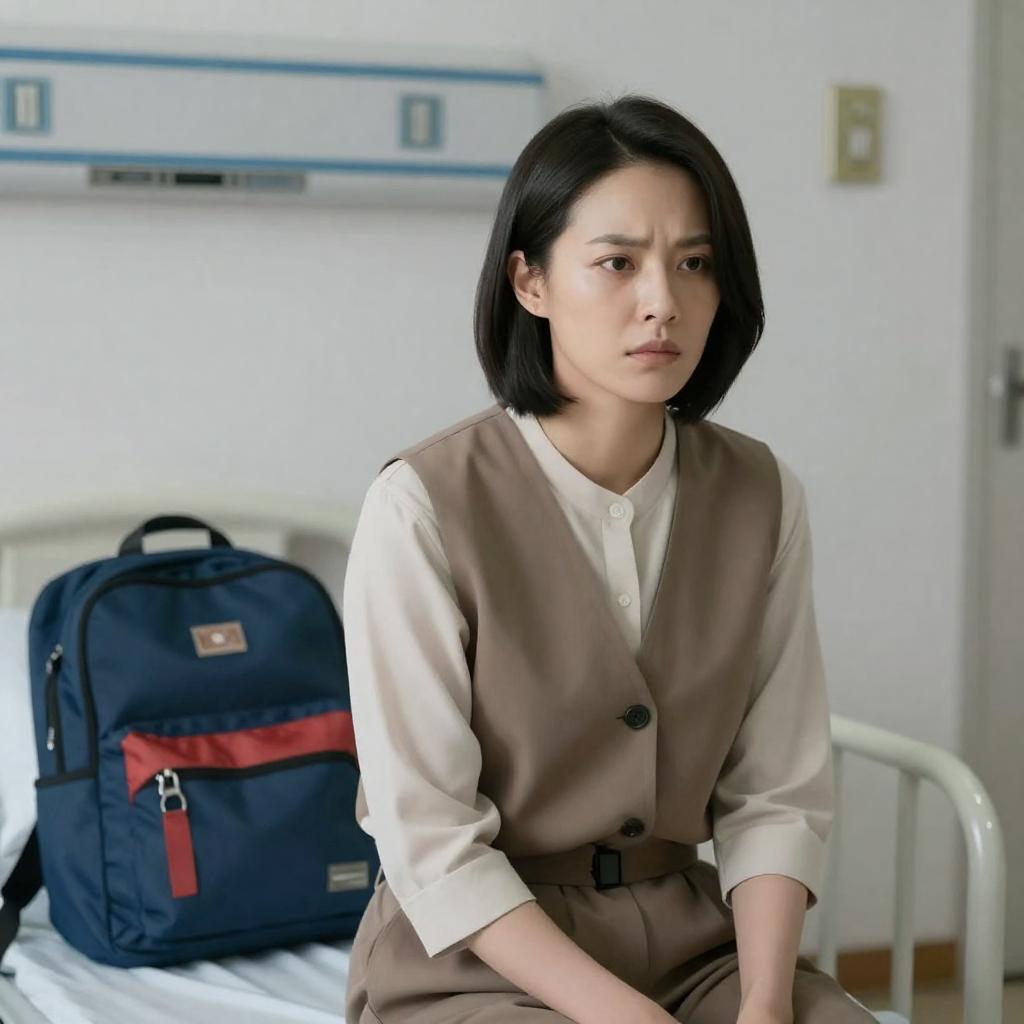 Asian woman with short black hair, wearing a beige shirt and brown vest, sitting on a hospital bed. Blue backpack with red on left, metal bed frame, white walls, coat hook, and light switch in background. Intense expression.