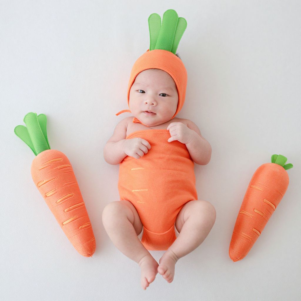 Photograph of a baby lying on a white surface, wearing an orange carrot onesie with a green leafy top. The onesie covers the baby's torso and head, resembling a carrot with two green leafy extensions on top. The baby's chubby cheeks and small hands are visible. Two large, plush carrot props, also with green leafy tops, are placed on either side of the baby. The baby has a neutral expression and is positioned centrally in the image, with the white background providing a clean, minimalist look. The image has a playful, cute, and vibrant feel.