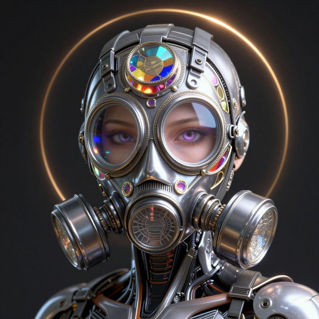 Photorealistic CGI of a person wearing a futuristic, metallic gas mask with colorful lenses, reflective surfaces, and glowing circular background.