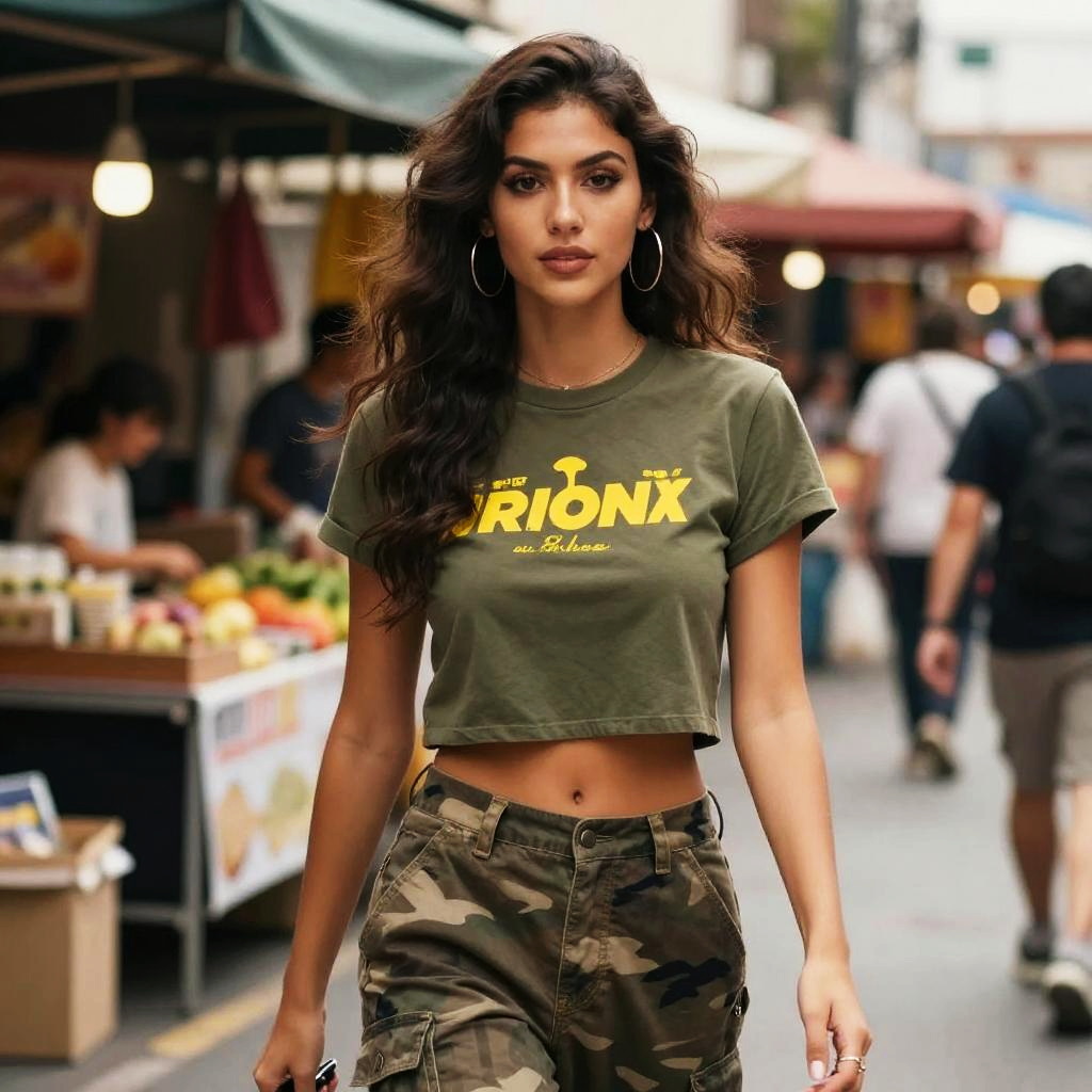 Photograph of a young woman with long, wavy brown hair and tan skin standing outdoors. She's smiling and wearing a white crop top with "EWERLY" in black letters, showing a camouflage pattern over her breasts. She's also wearing high-waisted, camouflage-patterned pants. The background is a sunlit, urban sidewalk with blurred palm trees and buildings. The image has a slight, realistic CGI touch.