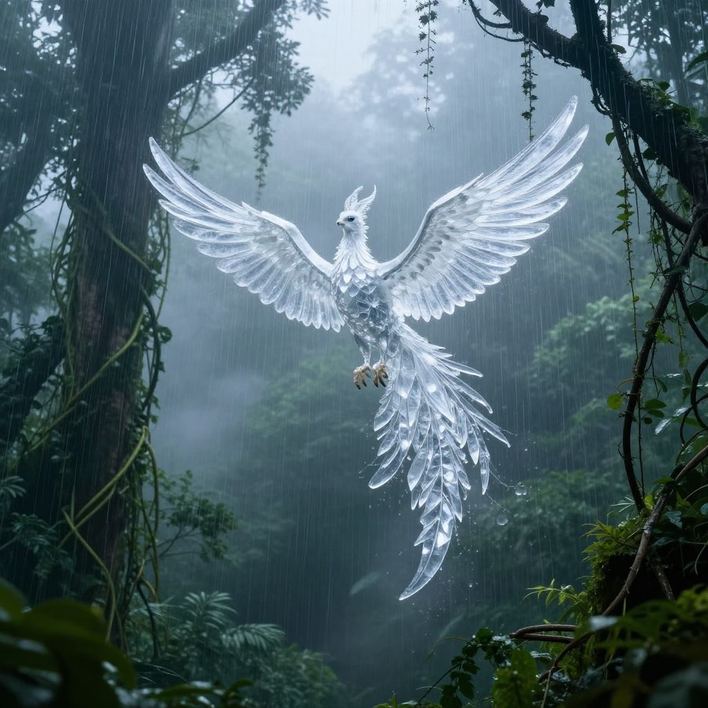 Crystal phoenix flying through rainforest canopy, vines, foggy, realistic, mystical, fantasy