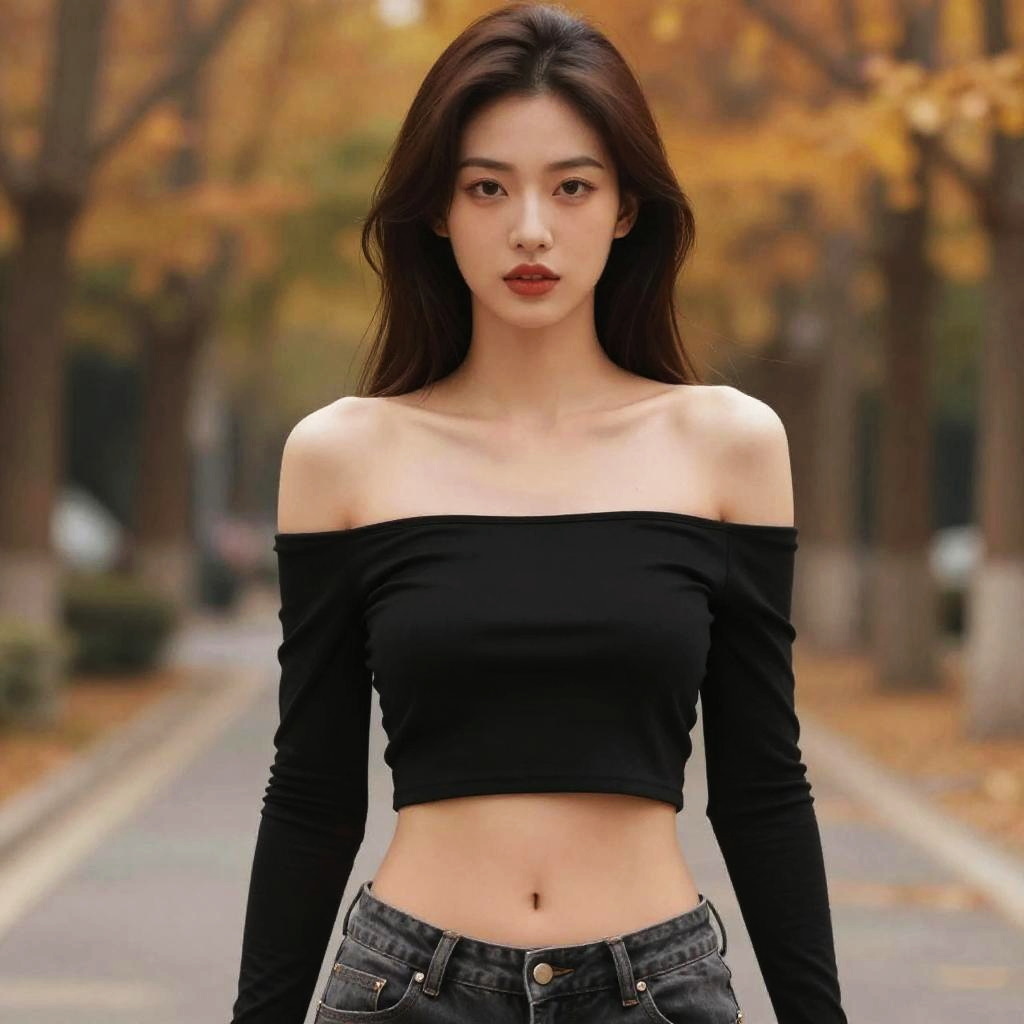 Photograph of an Asian woman with long black hair, wearing an off-shoulder black crop top and black jeans, standing on a tree-lined autumn