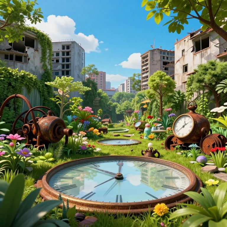 Imagine a surreal landscape where an enchanting garden teeming with vibrant colors merges with an abandoned urban wasteland. This dreamlike scene captures the essence of nature's relentless reclaiming of man-made structures, juxtaposing rusted machinery and crumbling buildings against lush greenery. As you draw nearer from an insect-like perspective, the ground appears to be composed of colossal, translucent timepieces, each one ticking in harmony while reflecting the cerulean sky above. The atmosphere is imbued with a sense of malleable time, evoking both hope and despair within this captivating visual tapestry that blurs the lines between reality and fantasy.