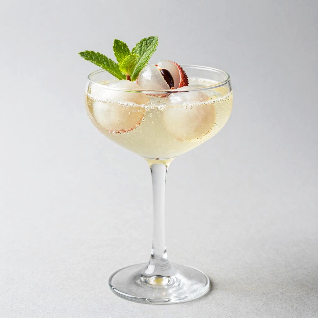 A bubbling lychee soda in a smoked glass coupe, garnished with peeled lychee and a mint sprig. This artistic representation features bright colors and a minimalistic design, creating an inviting atmosphere for a refreshing summer drink.