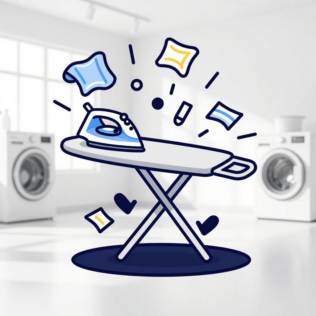 A cartoon illustration of a bouncy ironing board with expressive eyebrows and bouncing legs causing laundry items to scatter in a bright modern laundry studio with minimalist decor, conveying an energetic and playful vibe under dynamic lighting. Vector T-shirt graphic, bold contour lines, flat colors, white background.