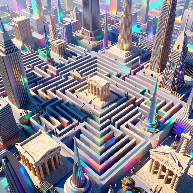 This is a vibrant, digital CGI illustration depicting a futuristic cityscape from an aerial perspective. The image features a complex maze-like structure in the center, surrounded by tall skyscrapers with reflective, colorful neon lights. The buildings vary in architectural style, including classical columns and modern spires. The maze's walls are white with black pathways. Tiny human figures, dressed in colorful clothes, navigate the maze. The background showcases a bustling city with more skyscrapers, each adorned with glowing, multicolored lights, creating a lively and futuristic atmosphere. The overall style is highly stylized and abstract, with a focus on bright, contrasting colors and sharp geometric lines.