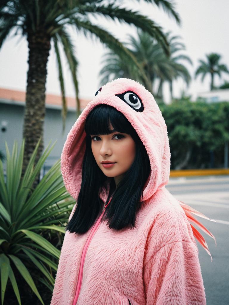 Flamingo costume homemade, solo, bird, tree, palm tree, 1girl, realistic, hood, outdoors, looking at viewer, blurry, day, blurry background, black hair