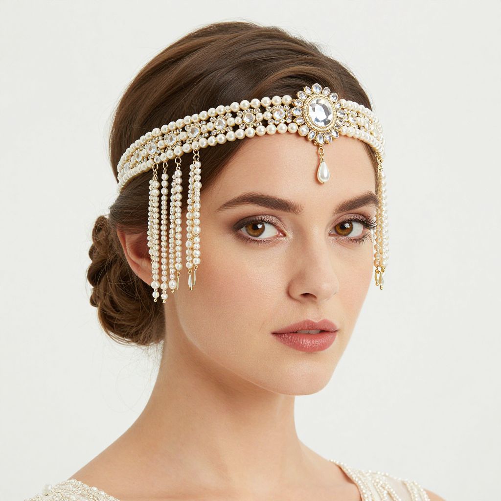 A woman elegantly showcases a 1920s vintage Great Gatsby-inspired headband adorned with crystal pearls and tassels, exuding a timeless, high-definition bridal aesthetic against a clean white backdrop.