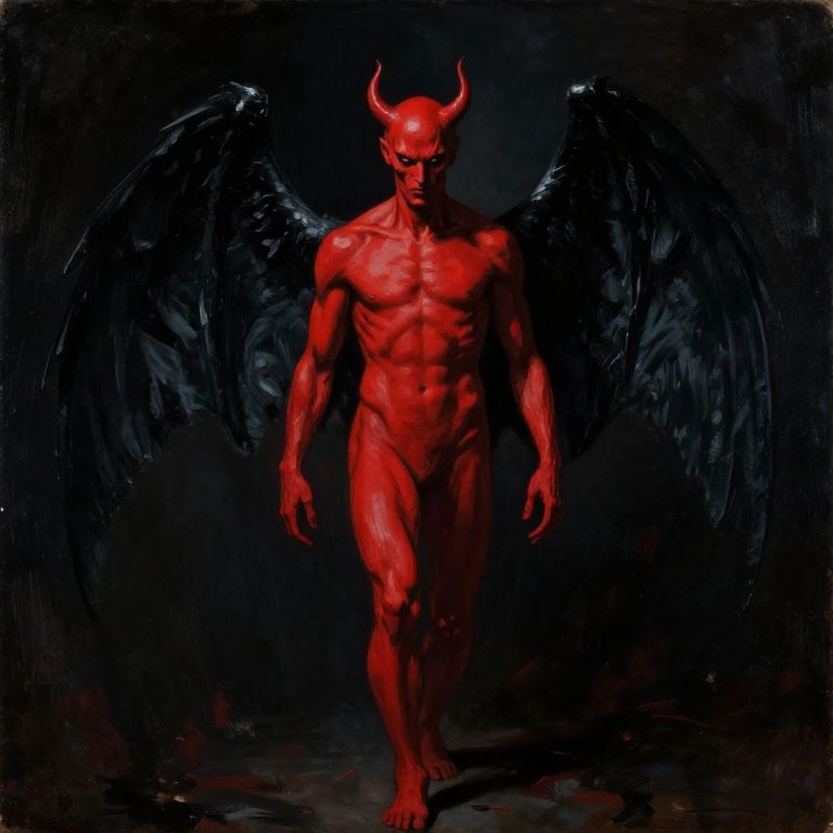 Cuboid A red devil in the shadows, full body, looking straight ahead, black wings, red skin, sinister, evil, oil painting, art by Caravaggio,