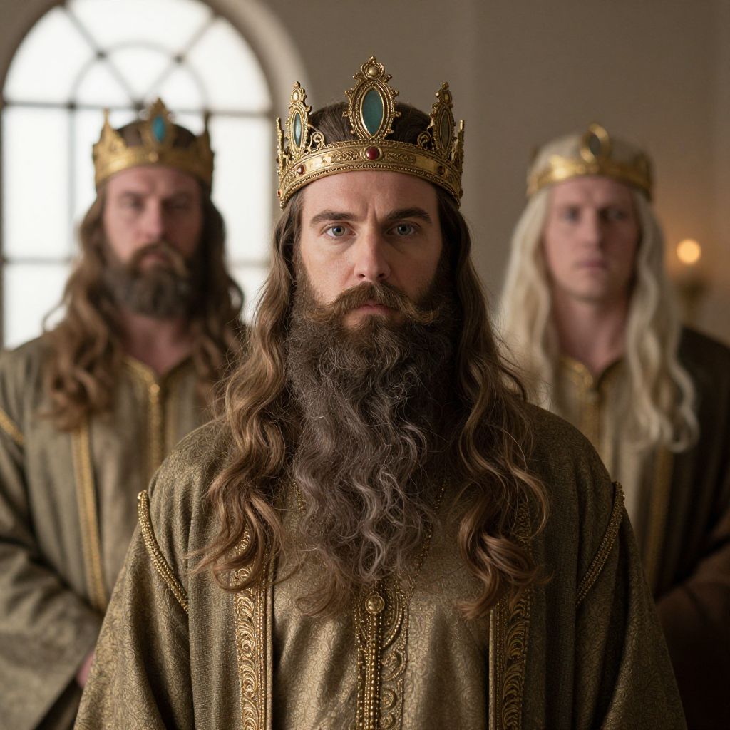 Three wise man costume, 1boy, solo, male focus, beard, facial hair, crown, looking at viewer, long beard, robe, window, blurry