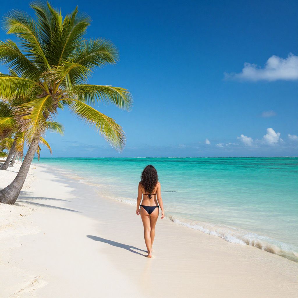 Woman strolling along a pristine, palm-fringed beach under a vibrant blue sky, with crystal-clear turquoise waters of the Caribbean Sea stretching to the horizon in the Antilles, Central America.