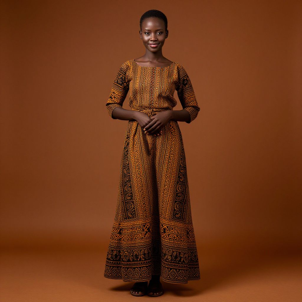 "Zimbabwe Traditional Dress, woman in traditional dress standing in front of a brown background"