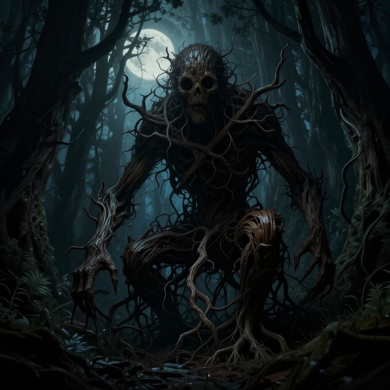 Digital artwork depicting a terrifying, humanoid creature with a skeletal face and twisted, branch-like limbs, emerging from a dark, dense forest at night. The creature's dark, gnarled form is silhouetted against a bright full moon in the background, casting eerie light and shadows. The forest is filled with tall, shadowy trees, creating a sense of depth and mystery. The creature's eyes are hollow and menacing, adding to the overall ominous atmosphere. The color palette is dominated by dark blues and blacks, with the moon providing a stark white contrast. The texture of the creature's limbs is rough and twisted, resembling ancient, withered wood.