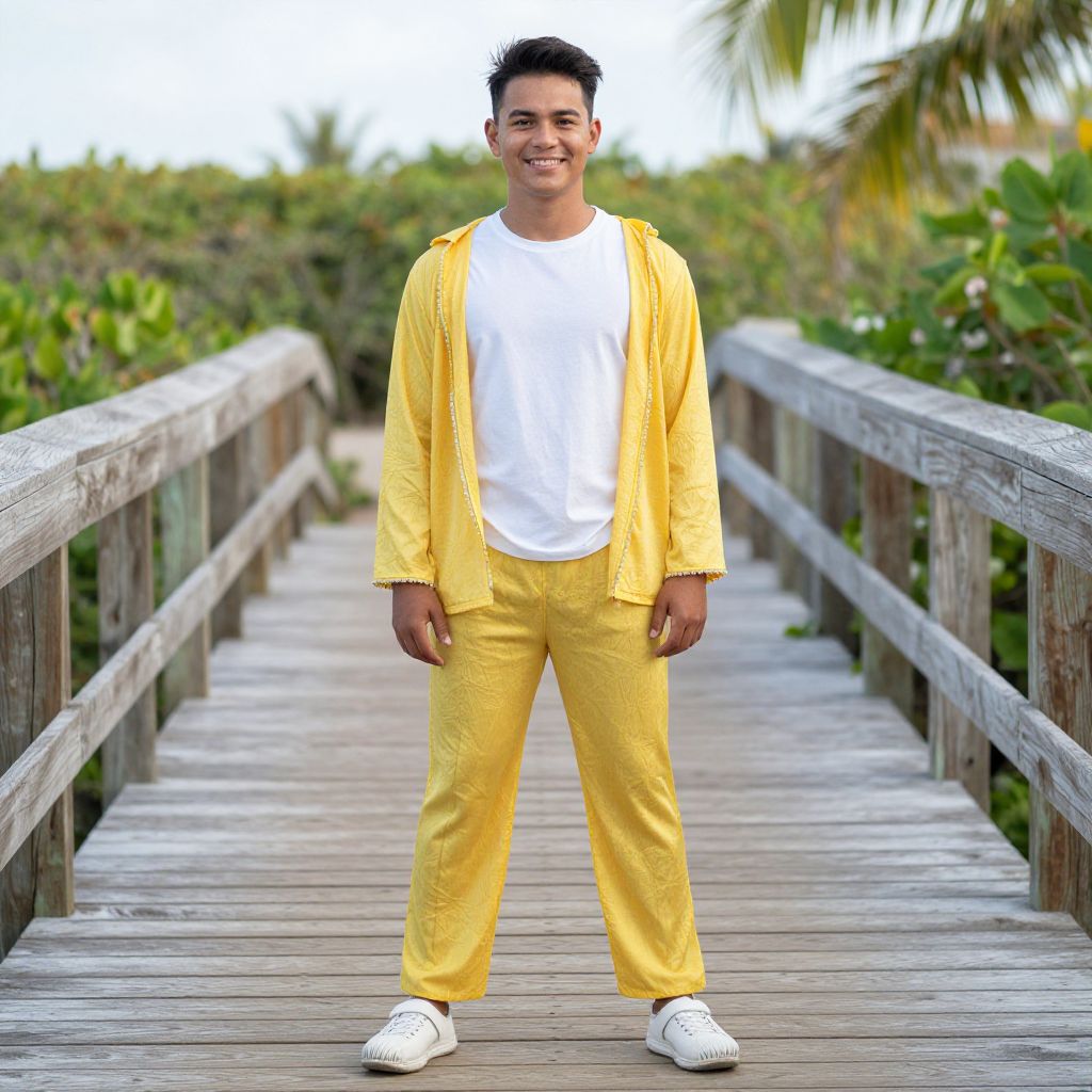 Photograph of a smiling man with short black hair, wearing a yellow jacket, white t-shirt, yellow pants, and white sneakers, standing on a