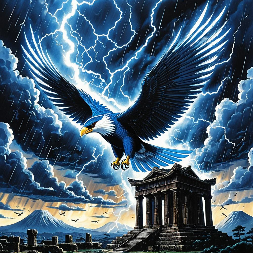 A giant tortoise, with a shell covered in lush greenery, ancient wisdom in its eyes, soaring over a tranquil ocean at dawn, surrounded by drifting clouds, drawn in the majestic and symbolic anime style of Osamu Tezuka.