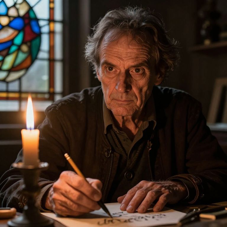 A hyperrealistic portrait of a mysterious artist in their late 40s reveals intricate details and deep-set eyes, reflecting a life rich with stories. Illuminated by warm candlelight filtering through stained glass, the subject's well-traveled face bears subtle lines of wisdom and experience. Viewed from an unusual angle, almost as if beneath the table, the artist appears engrossed in their work, blending classical realism with contemporary motifs. This unique perspective, coupled with the interplay of light and shadow, evokes a sense of introspection and reverence for the creative process.