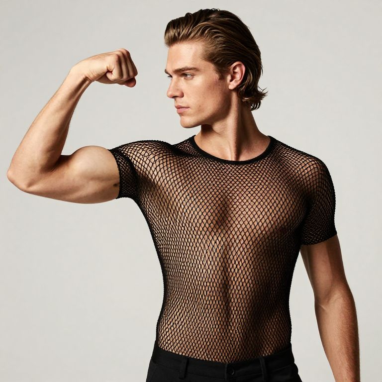 Photograph of a muscular, Caucasian man with short, slicked-back brown hair, flexing his right bicep. He wears a black, see-through fishnet shirt that reveals his defined chest and abs, and black pants. His skin is fair, and he is looking to his right with a focused expression. The background is a plain, bright white, making the subject stand out. The lighting highlights the contours of his muscles and the texture of the fishnet fabric. The overall style is bold and striking, emphasizing strength and confidence.