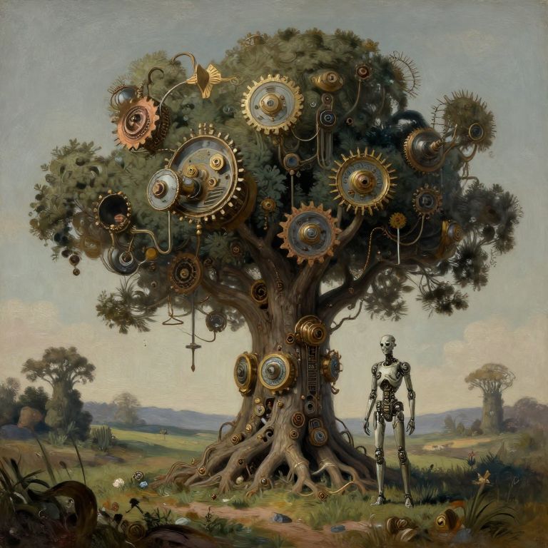A surreal, steampunk-inspired tree with intricate mechanical elements and a cybernetic figure standing beside it, set against a muted, oil-painted landscape.