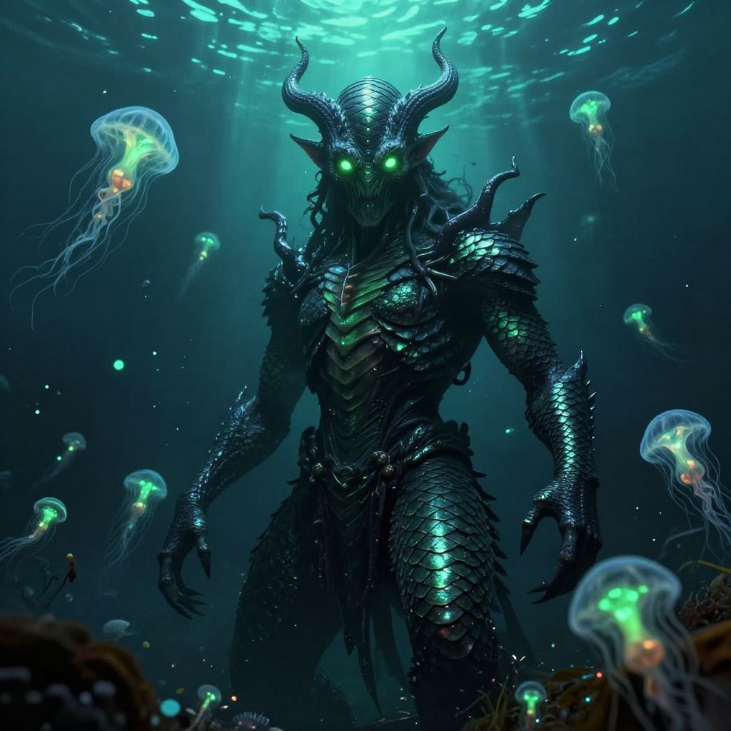 Digital artwork of a dark, glowing, horned demon with green eyes, surrounded by bioluminescent jellyfish in a deep, blue underwater scene