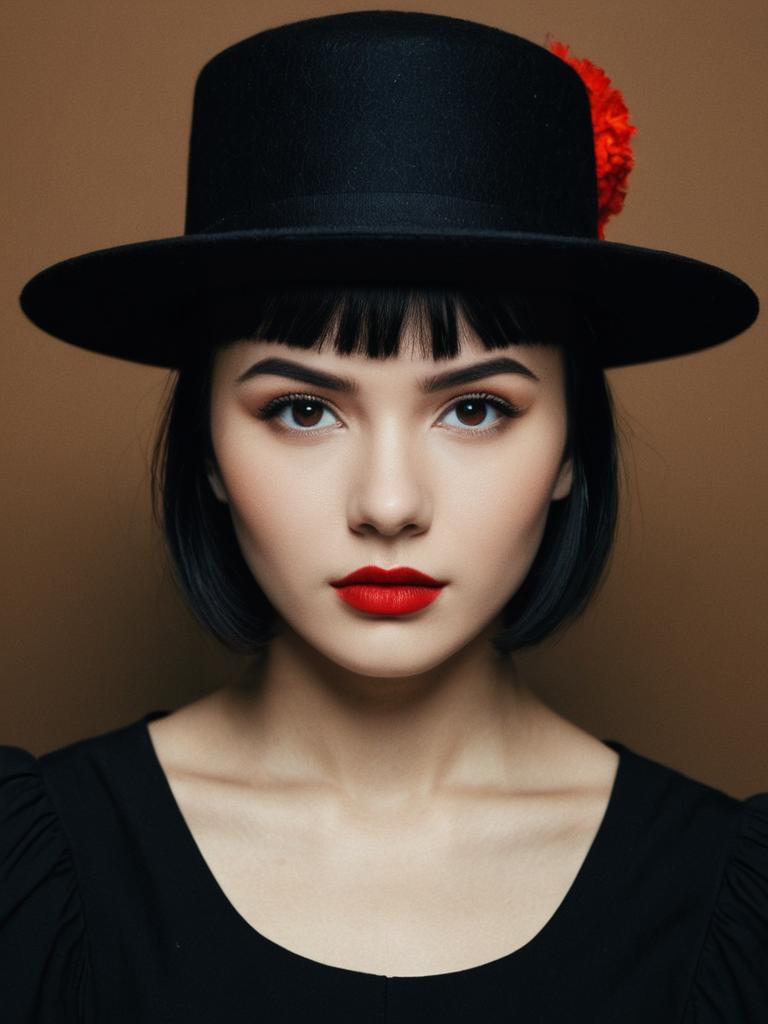 Close-up portrait of a young woman with short black hair and straight bangs wearing a black wide-brimmed hat with a beige trim. She has striking red lipstick and natural makeup, dressed in a sleeveless black dress, against a plain brown background. The woman has a neutral expression looking directly at the camera.