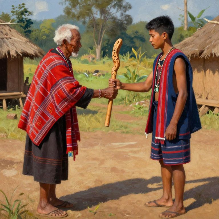 Traditional handover ceremony in a tribal village, elder handing over a carved wooden staff to a young successor, vibrant textiles and nature backdrop, warm sunlight casting long shadows, painterly style emphasizing cultural heritage and honor