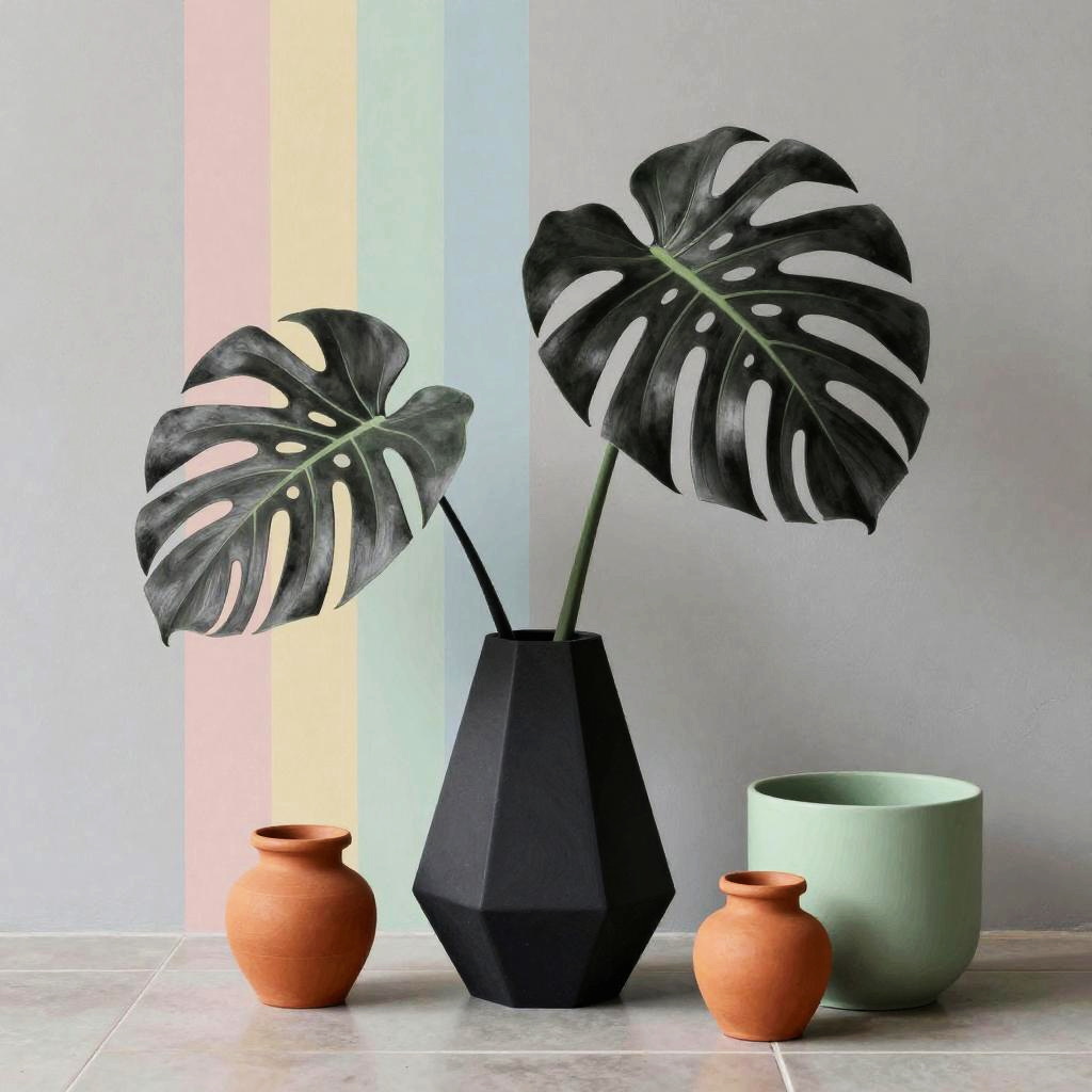 A charcoal sketch with minimalistic shading of monstera leaves in a matte black geometric vase with small terra-cotta jars and a soft green planter. Set against vertical pastel stripes against a dove-gray textured wall on a tiled floor. Playful modern still life, Memphis-inspired geometry, saturated yet balanced color, clean negative space, high detail, crisp edges, soft studio lighting, cohesive composition.