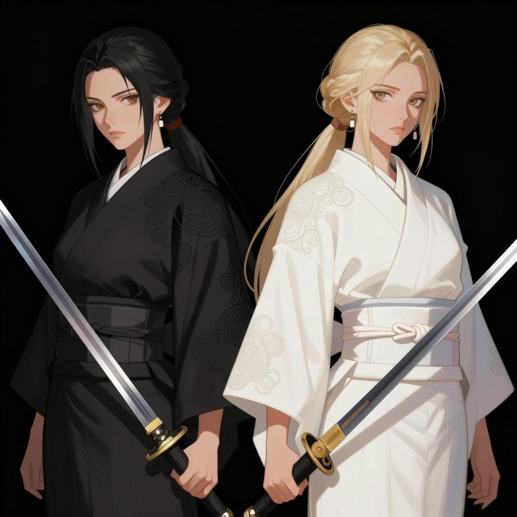Digital illustration of two identical female samurai with long black hair, intense expressions. Top: holding sword with white kimono, floral patterns, black hairband. Bottom: holding sword with black armor, gloves, hair flowing. Black background. Swords raised, hands gripping hilts.