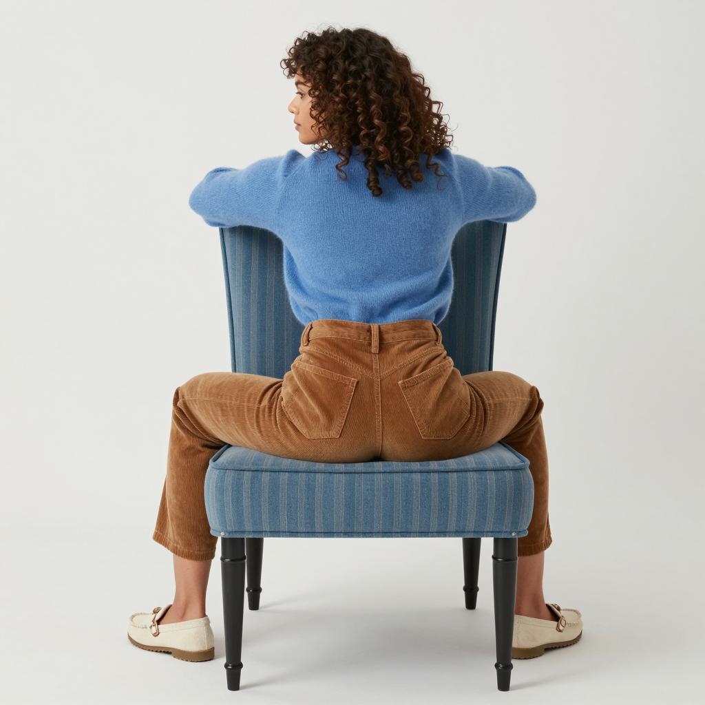 Woman with curly brown hair, blue sweater, and brown corduroy pants, sitting in a blue upholstered chair. She is bent over with her back to the camera, wearing white suede moccasins. Her arms rest on the chair's back, and her legs are crossed underneath her. The chair has vertical stripes, and the background is a plain white wall.