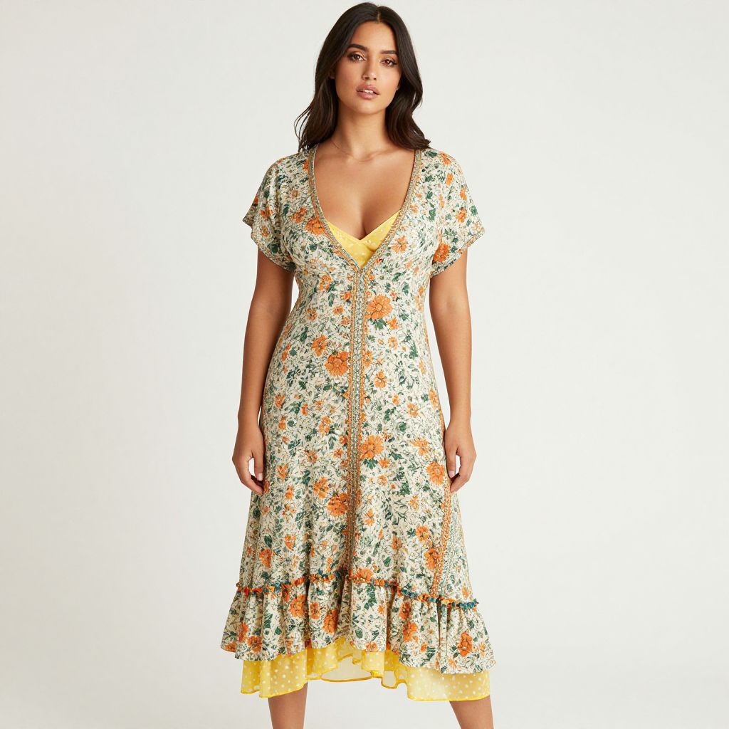 Woman, modern bohemian, knee-length dress with mixed floral patterns, short sleeves, round neckline, layered ruffle hem in contrasting print, relaxed fit, white base with orange and green floral design, layered over a yellow slip with delicate polka dots, standing in a simple, bright studio background.. Sexy. Pretty face and beаutiful eyes. Big breasts.