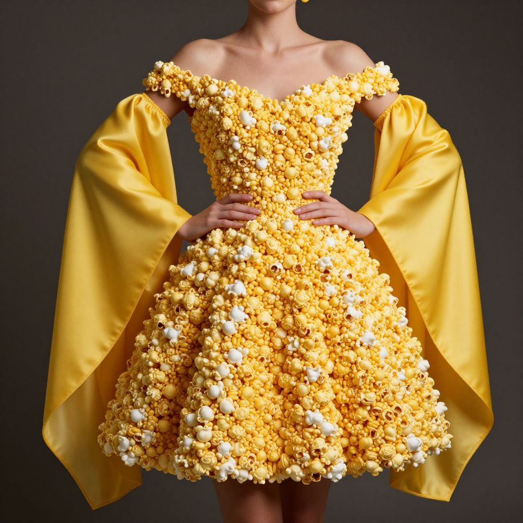 The image showcases a striking fashion photograph featuring a model adorned in a dress that creatively mimics the appearance of popcorn. The dress is composed of numerous small, realistic-looking popcorn kernels, meticulously arranged to form a voluminous, textured garment. The kernels are predominantly yellow, with occasional white kernels adding contrast and depth. The dress has a dramatic, off-the-shoulder silhouette with wide, flowing sleeves that cascade down the model's arms. The fabric appears to be a smooth, satin-like material, giving the dress a luxurious and elegant feel. The model's pose is confident and poised, with hands on hips, emphasizing the dress's dramatic and eye-catching design. The background is dark and muted, ensuring that the vibrant yellow of the popcorn kernels stands out prominently, drawing the viewer's attention directly to the dress and the model. The overall composition is balanced, with the dress and model centrally positioned, creating a strong focal point in the image.